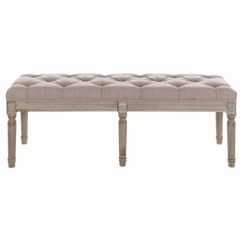 Lavica v provensálskom štýle z béžovej látky, čalúnené sedadlo s prešívaním, masívna drevená konštrukcia, 120 cm, na sklade