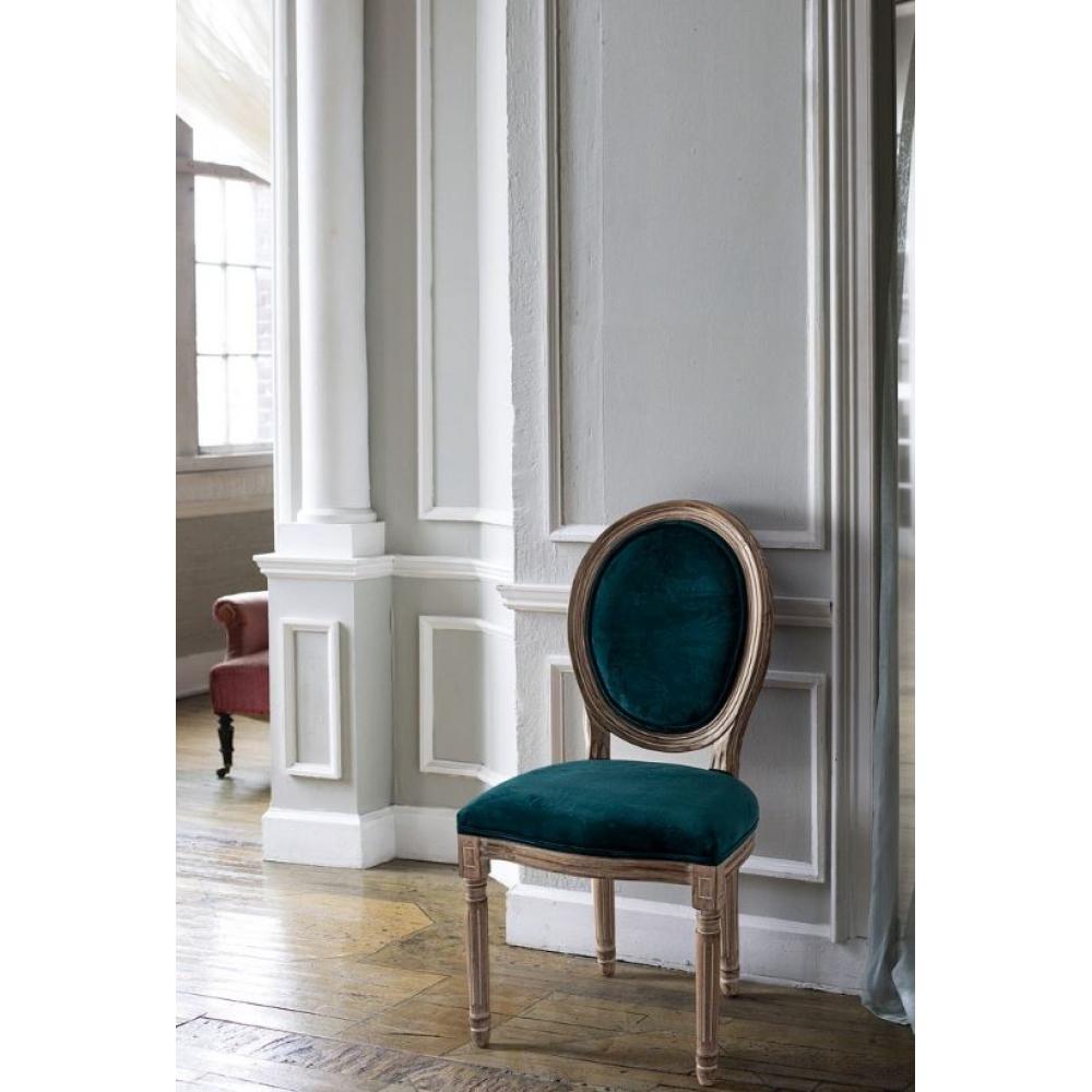 Čalúnenie je modré, z umelého vlákna zamat, vďaka ktorému je stolička odporúčaná pre provensálske, elegantné country, civilné štýlové interiéry, vhodné do jedálne, zasadačky alebo aj ku písaciemu stolu.
