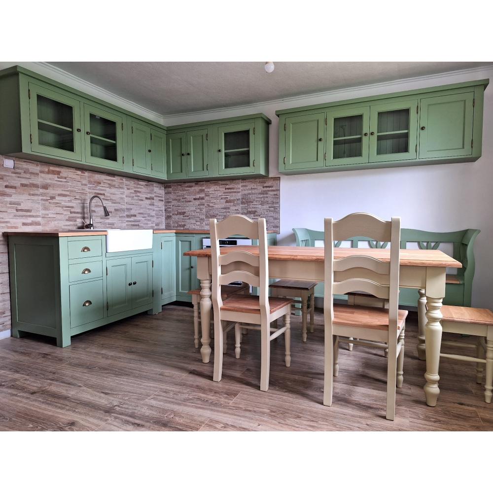 Táto kompletne kuchyňu tvoriaca sada produktov pozostáva z mimoriadne praktických modulov, telo modulov je zo 100% masívneho borovicového dreva, pracovná doska je zo 100% masívneho dubu.