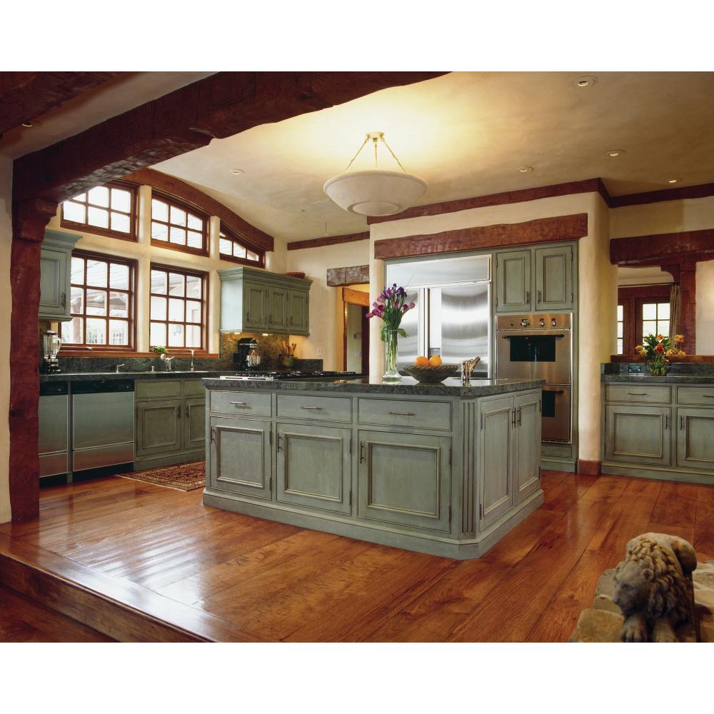 Antikovaný zelený cottage kuchynský nábytok s dubovou podlahou