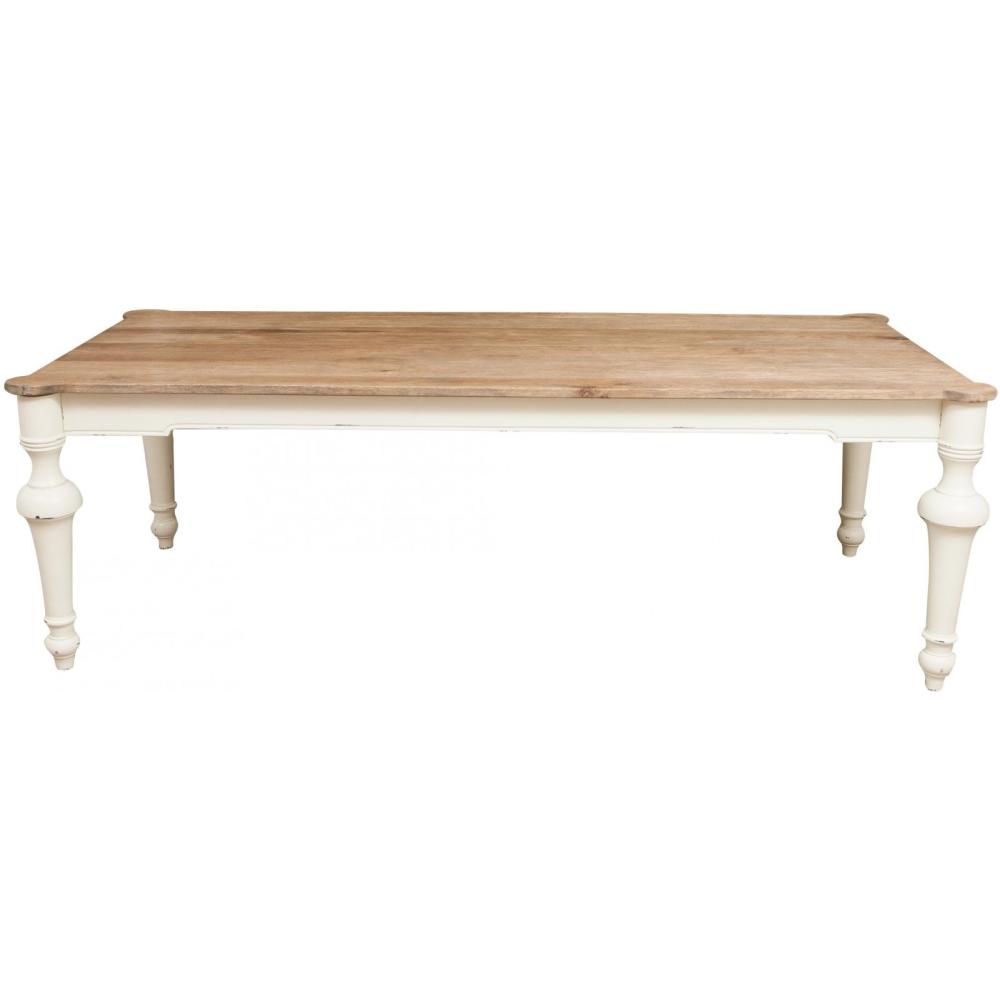 Stôl v country štýle z masívneho cédrového a dubového dreva (doska) s natretými bielymi, patinovanými nohami a prirodzene sfarbenou dubovou doskou je nábytkom vysokej kvality.