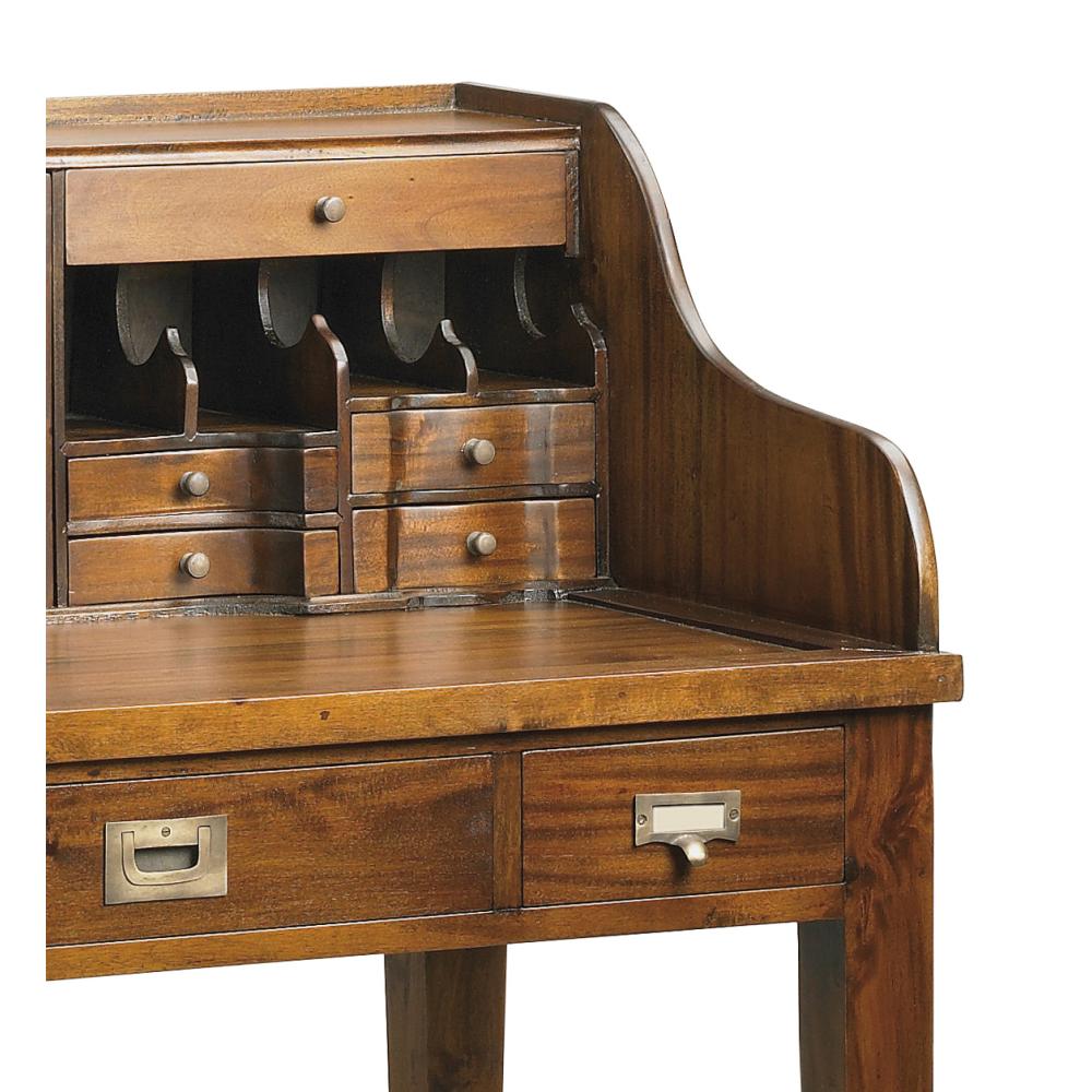 Klasický koloniálny štýlový písací stôl z masívneho dreva, s malými zásuvkami a úložným horným dielom.