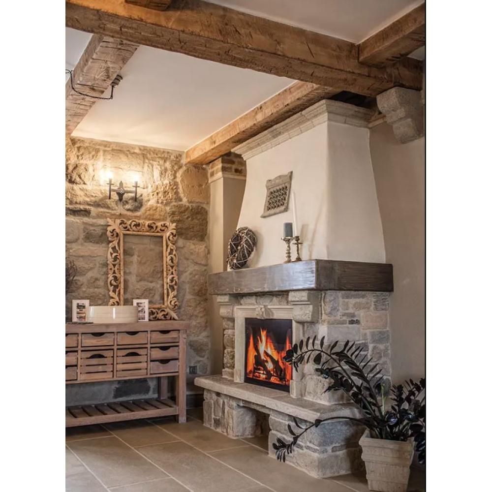Cena zahŕňa všetko od zeme po vodorovný drevený nosník, spredu aj zo strany (nie však štandardnú, továrenskú krbovú vložku).