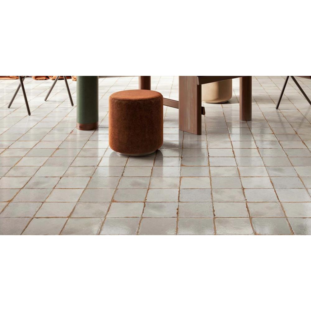 Lesklá biela podlahová dlaždica s antikovanými okrajmi, ktorá je mrazuvzdorná, teda vhodná aj na vonkajšie použitie ako obklad, ale môže byť tiež navrhnutá ako stenový obklad.