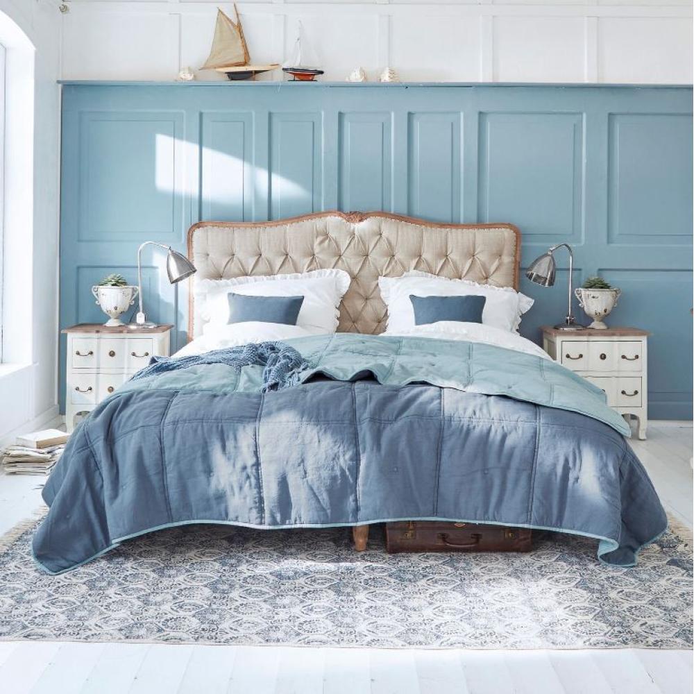 LB Štýlový country rám postele s čalúneným, prírodným ľanovým poťahom na čele, s vyrezávanými nohami z mangového dreva / pre matrac 180x200 cm