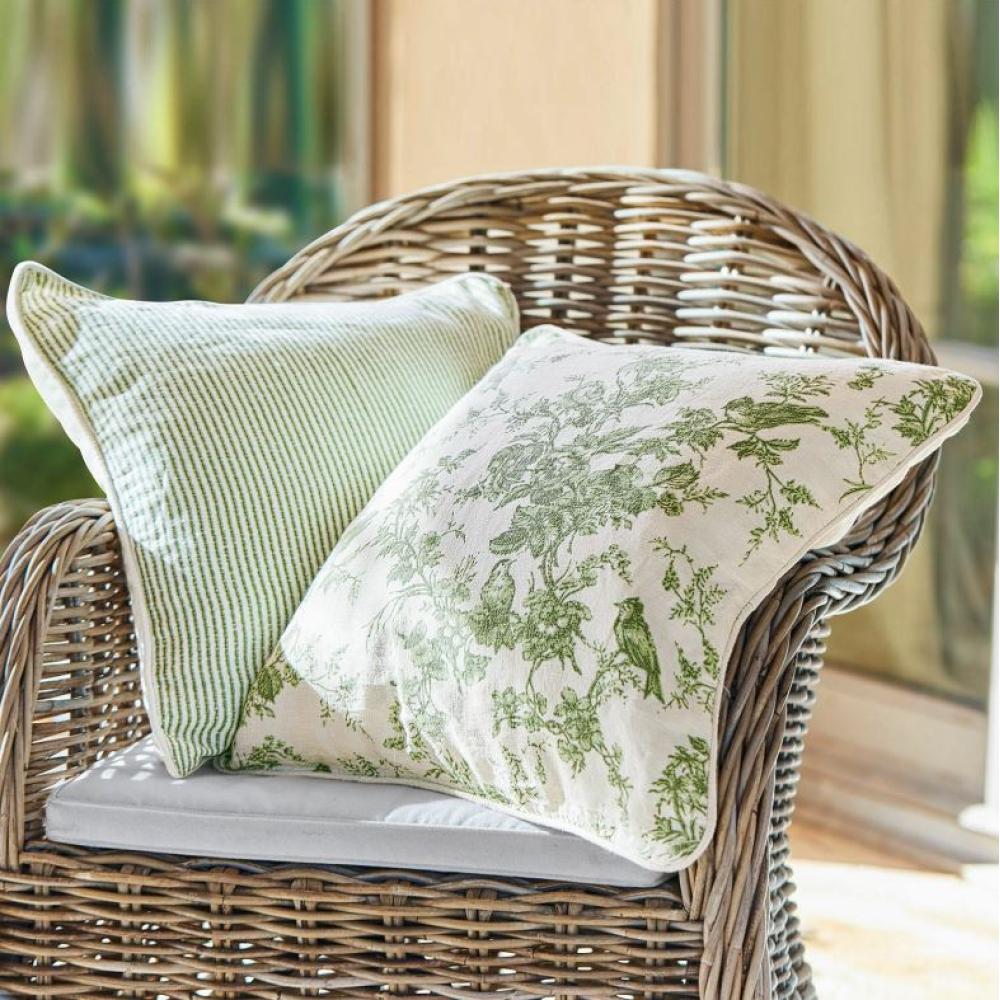 Jedným z vankúšov v 2-dielnej sade je tenký, jemne zelený pruhovaný, druhý má milý povrch zdobený motívmi vtákov a rastlín.
