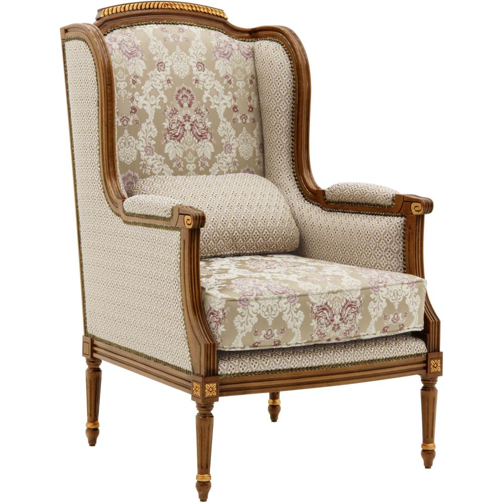 Pohodlné kreslo v klasickom štýle, s bukovou konštrukciou a vysokou opierkou chrbta. Sedací vankúš kresla je vystužený popruhmi a čalúnený kvalitnou penou, a navyše obsahuje vankúš pre zvýšenie komfortu. Odporúčame do elegantných vil, kaštieľov, vyššej triedej občianskych salónov, obývačiek alebo ako výborné kreslo na čítanie. Nábytok je vyrobený v Taliansku, prvotriedny, ručne vyrábaný produkt!