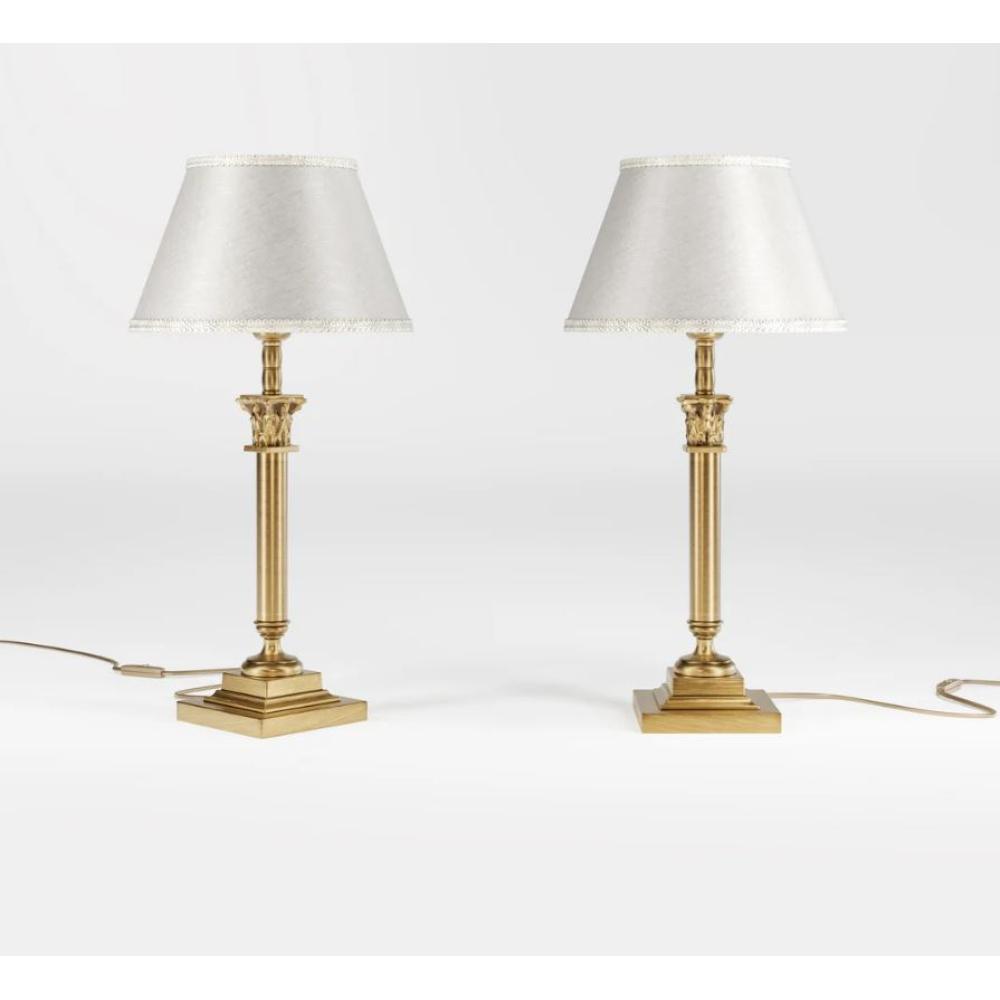Klasický štýlový stolný lampa z mosadze s elegantným strieborným tienidlom.