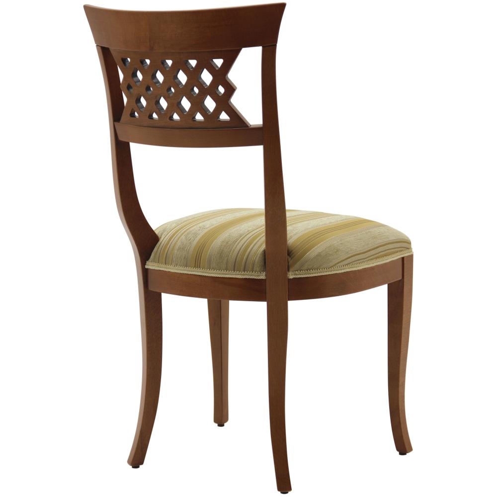 Pohodlný, klasický štýlový jedálenský stoliček s bukovou konštrukciou. Jedinečnou vlastnosťou produktu je operadlo, ktoré nie je čalúnené, ale má obzvlášť zložitý dizajn z dreva. Sedák stoličky je vystužený remeňom a kvalitnou penou. Čalúnenie je možné prispôsobiť nitmi, tkaním alebo švom. Odporúčame pre elegantné vily, zámky, luxusné meštianske salóny, alebo dokonca aj do jedálne. Nábytok sa vyrába v Taliansku, ide o produkt vyššej kategórie, ručne vyrobený!