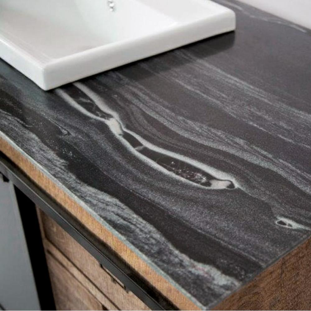 Je vyrobený ručne z mangového dreva, s tromi číslovanými zásuvkami, s kúzelným keramickým umývadlom a s tmavými železnými posuvnými dverami.