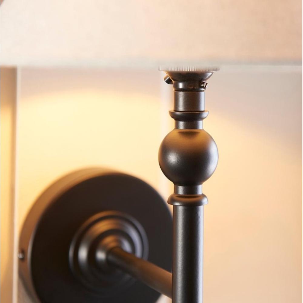Tá elegantná nástenná lampa je matnej čiernej farby a má nadčasový, kužeľový tienidlo, ktoré je vyrobené z prírodnej zmesy ľanu.