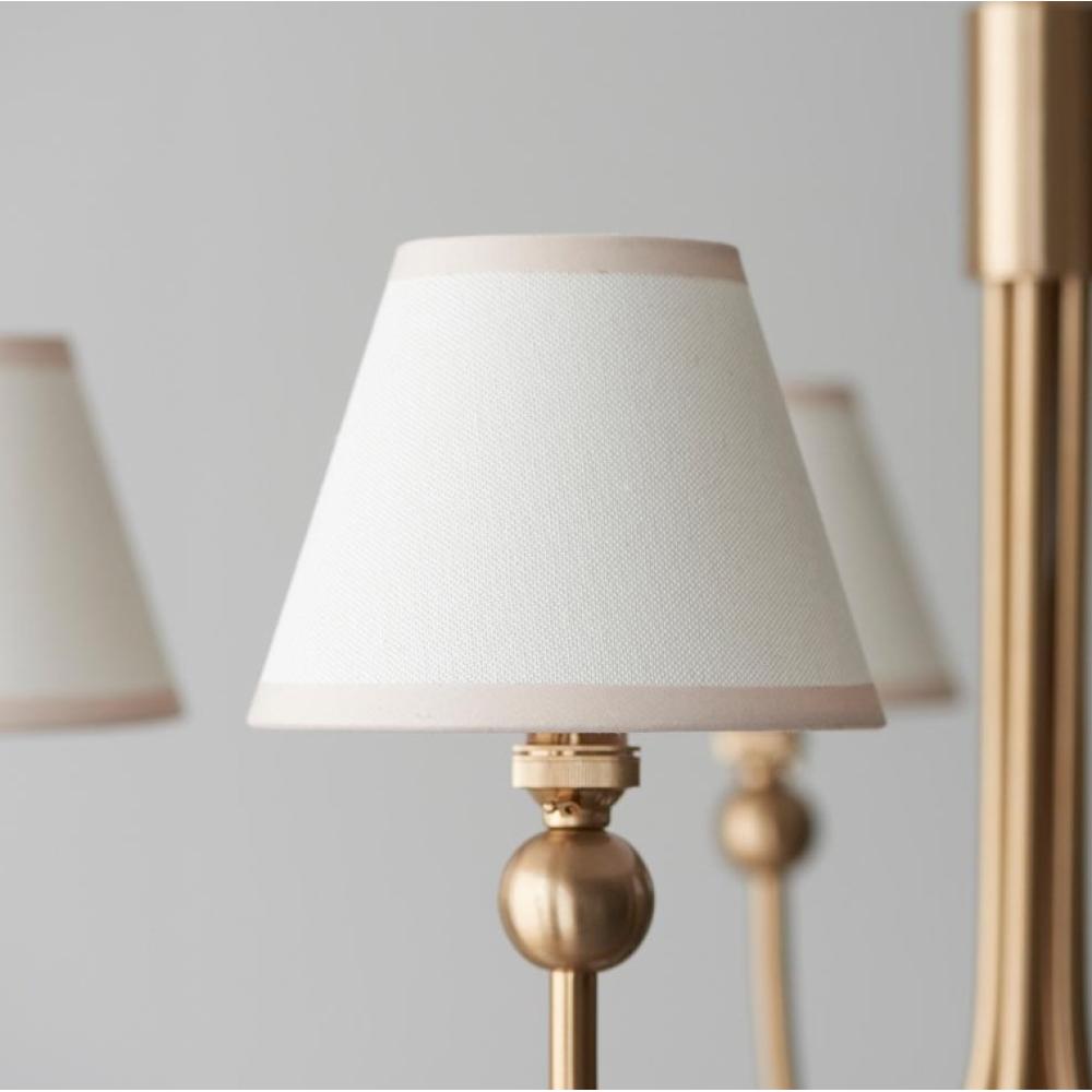 Dizajny minulosti inšpirovali, s čerstvým, obnoveným vzhľadom. Elegantný luster s 5 žiarovkami, s zakrivenými ramenami, klasický záves v brúsenom antickom mosadznom prevedení, nastaviteľná výška, visiaci na reťazi 1,5 m, so sivou pletenou látkovou clonou a päticami B22 pre autentický vzhľad. 5 kusov vintage a mandľovo-bielym 16 cm tienidlom Ivy dokončuje vzhľad.