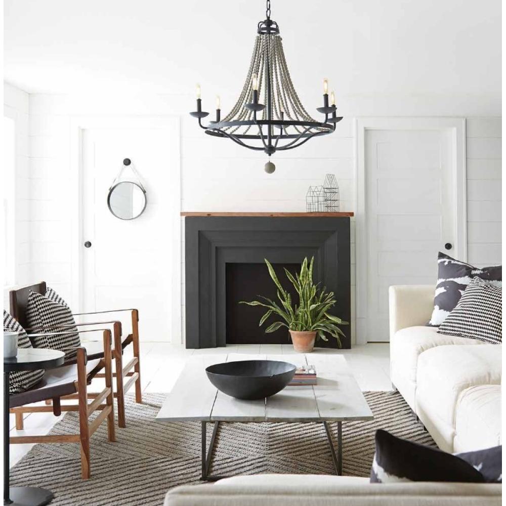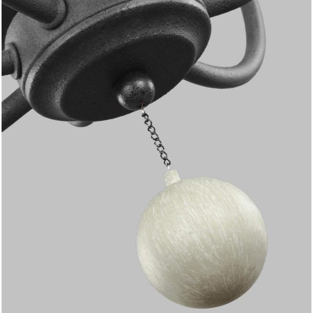 Lampa je naozaj výnimočná vďaka zakrivenej čiernej železnej konštrukcii a sivým perličkám naplaveného dreva.