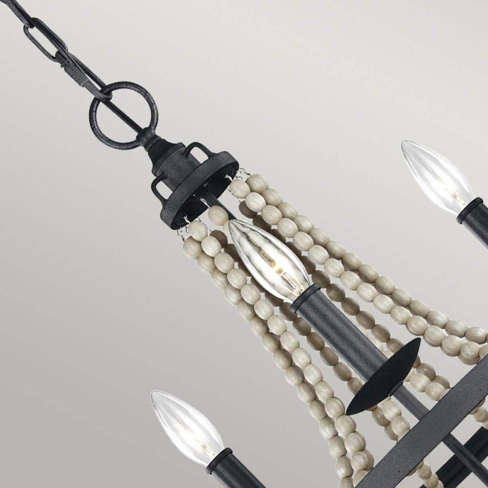Špeciálnosť lampy vytvára kombinácia oblúkového, čierneho železného tela a sivých korálikov z naplaveného dreva.