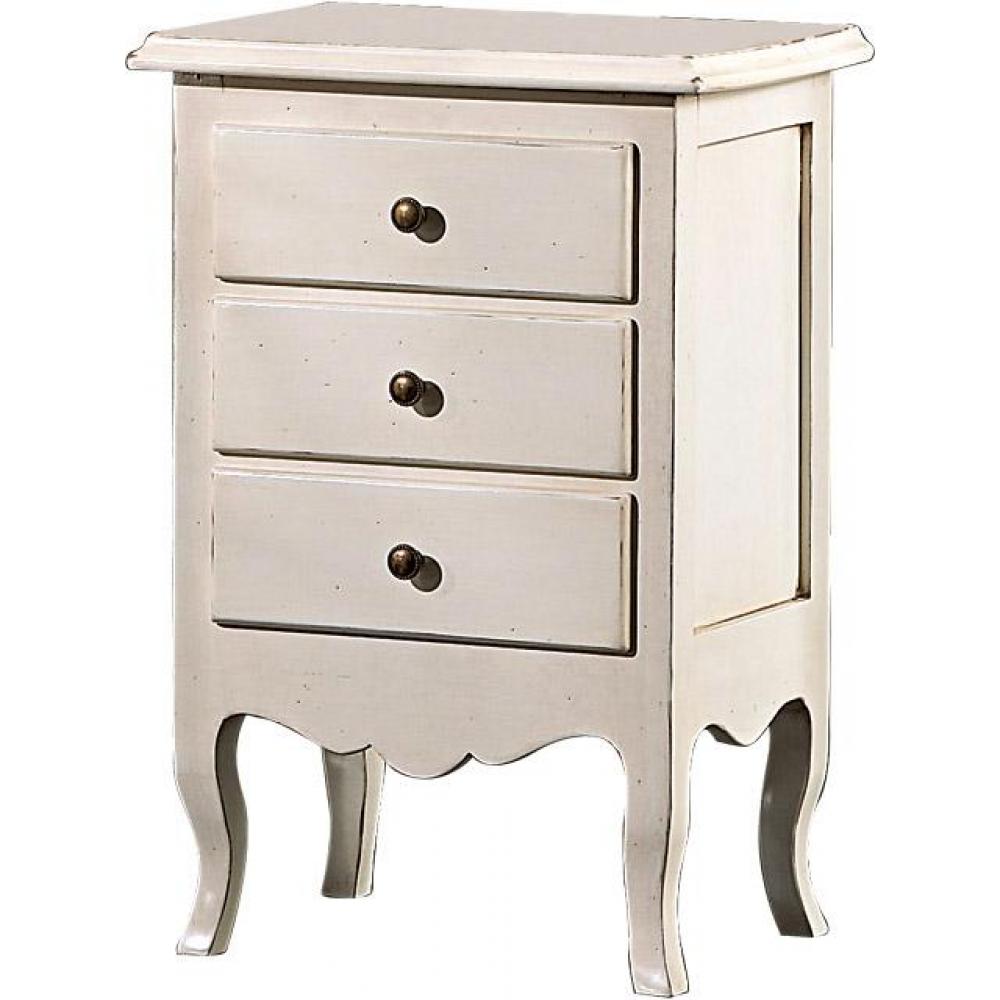 Klasický nočný stolík v patinovanej bielej farbe má elegantné nohy, ktoré vyžarujú eleganciu, a svojou svetlou farbou prináša späť atmosféru starých provensálskych víl.
