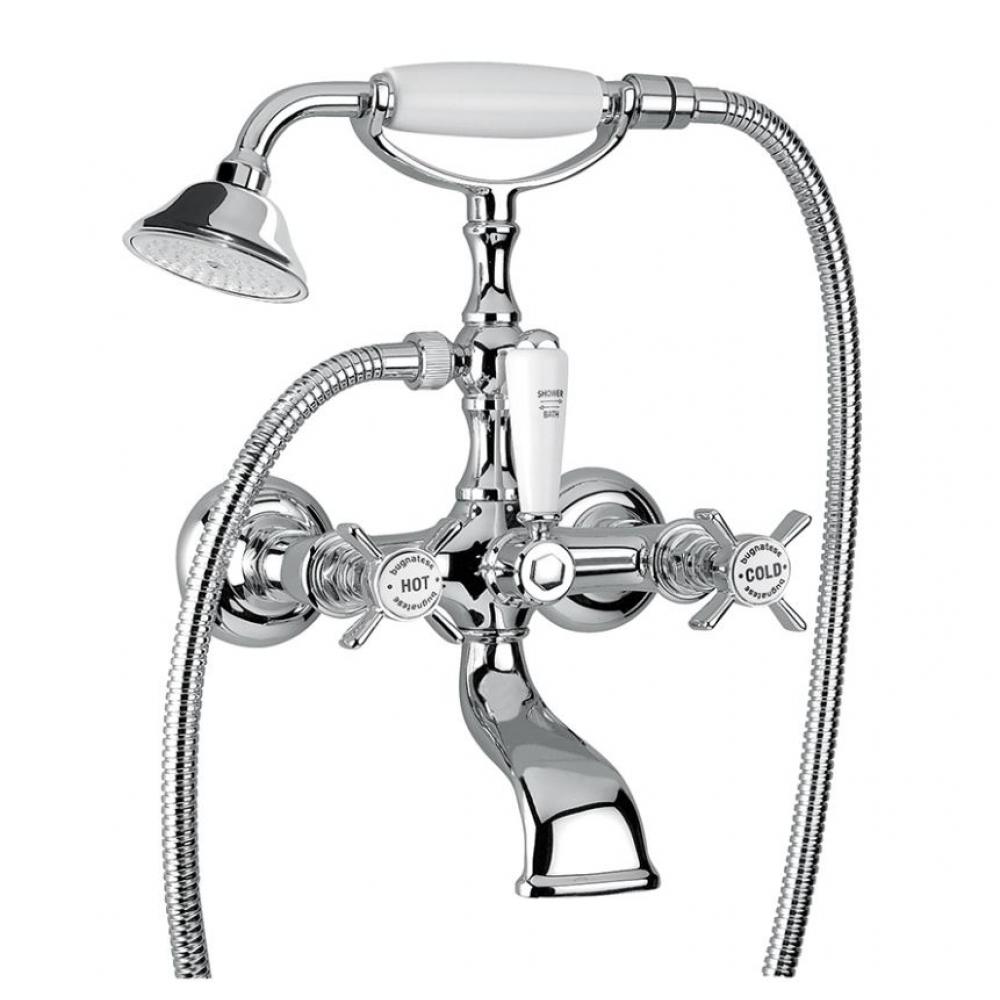 Na stenu montovateľná vodovodná batéria na plnenie vane so sprchovou hlavicou.