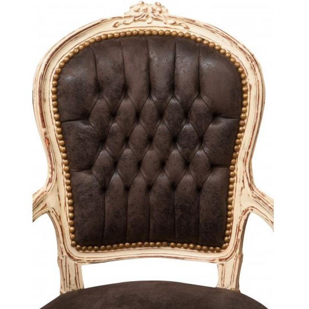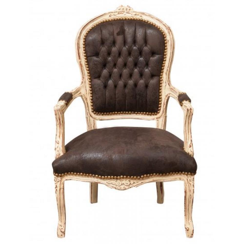 Kreslo v štýle Ľudovíta XVI s patinovanou krémovou drevenou konštrukciou a čalúnením zo tmavohnedej vintage koženkovej látky (alcantara) je nielen pekným riešením pre dnešný, moderný provensálsky obývací izba, ale možno ho začleniť aj do klasického, mestského alebo moderného loftovského interiéru.