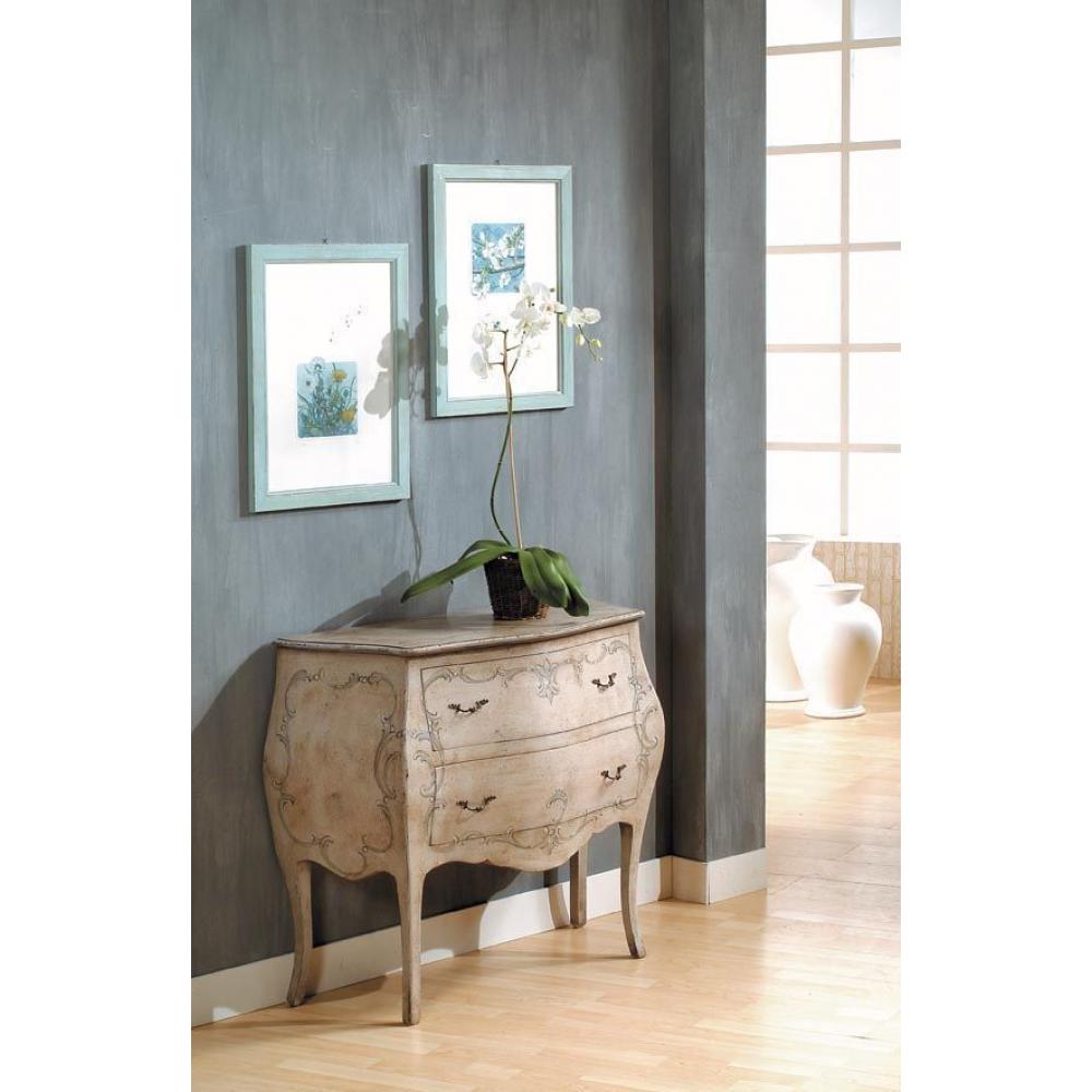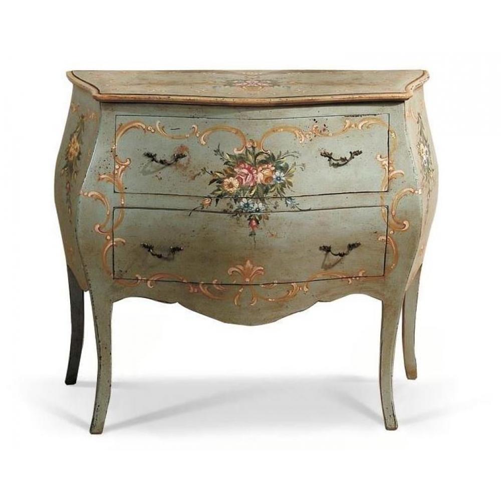 Klasický severotaliansky štýlový elegantný komoda s patinovaným základom kvetinovou dizajnovou maľbou a mosadznými úchytkami. Ručne vyrábaný taliansky produkt.