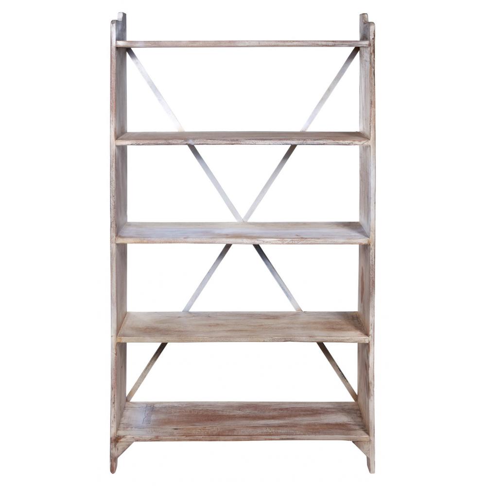 Knižnica v vintage štýle, s bielym opotrebovaným natretým povrchom, vyrobená z recyklovaného dreva.