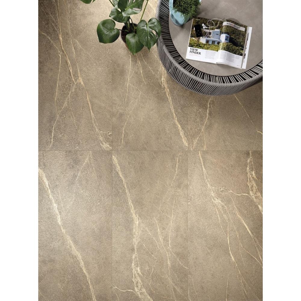 Rektifikovaná, leštená, hodvábne lesklá podlahová krytina, ktorá 100%-ne reprodukuje povrch prírodného kameňa. Jej vzor je originálny, digitalizovaná verzia kameňa nájdeného v prírode. Každá dlaždica je iná a jej vzor dodáva krytine prirodzenosť, zatiaľ čo hodvábny lesk eleganciu.