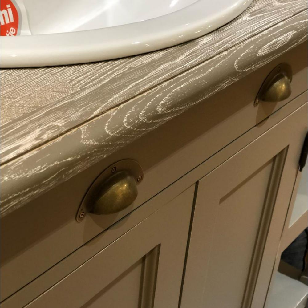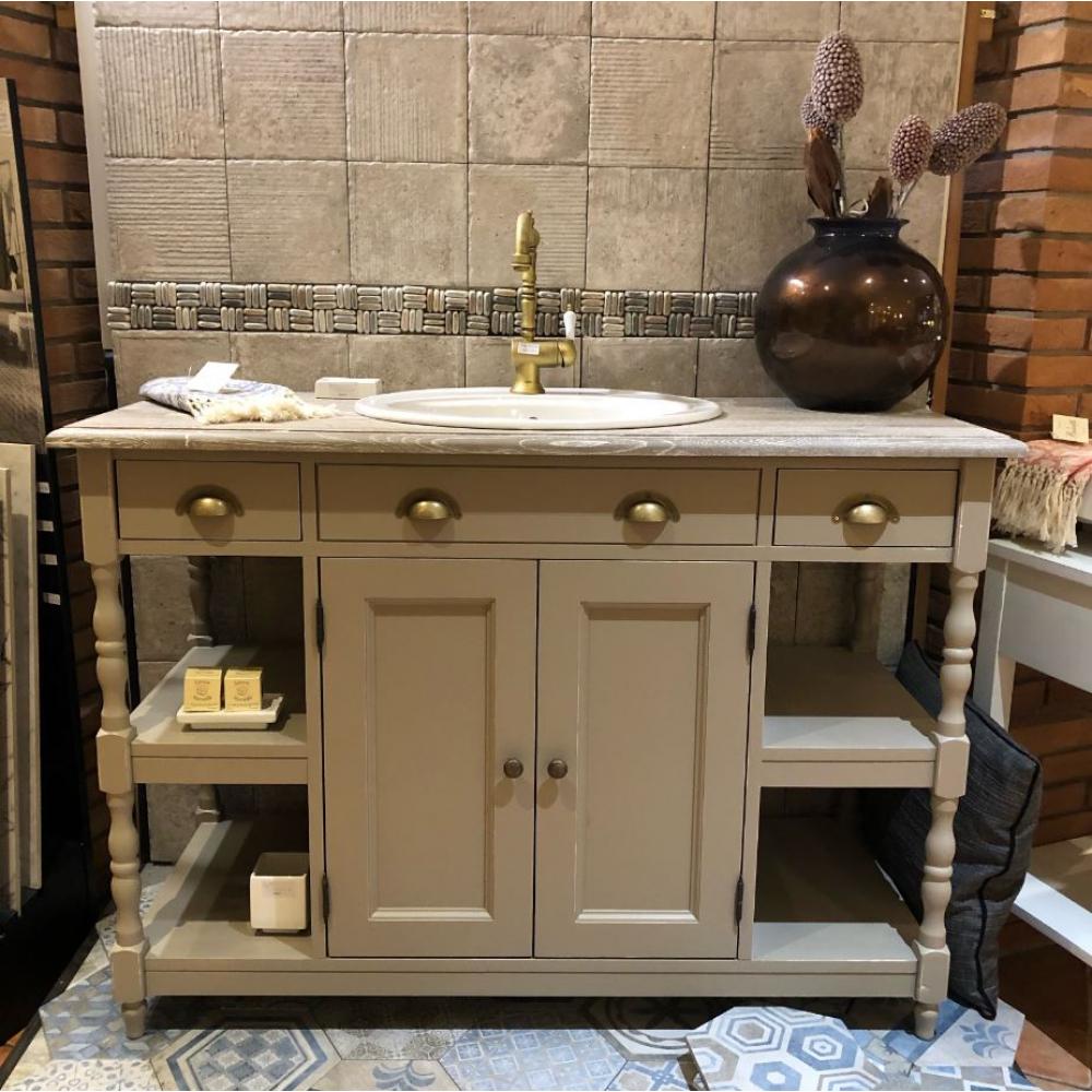 Rustikálna masívna kúpeľňová skrinka s country nádychom je vyrobená s modernou vodotesnou úpravou a s dubovým pultom.