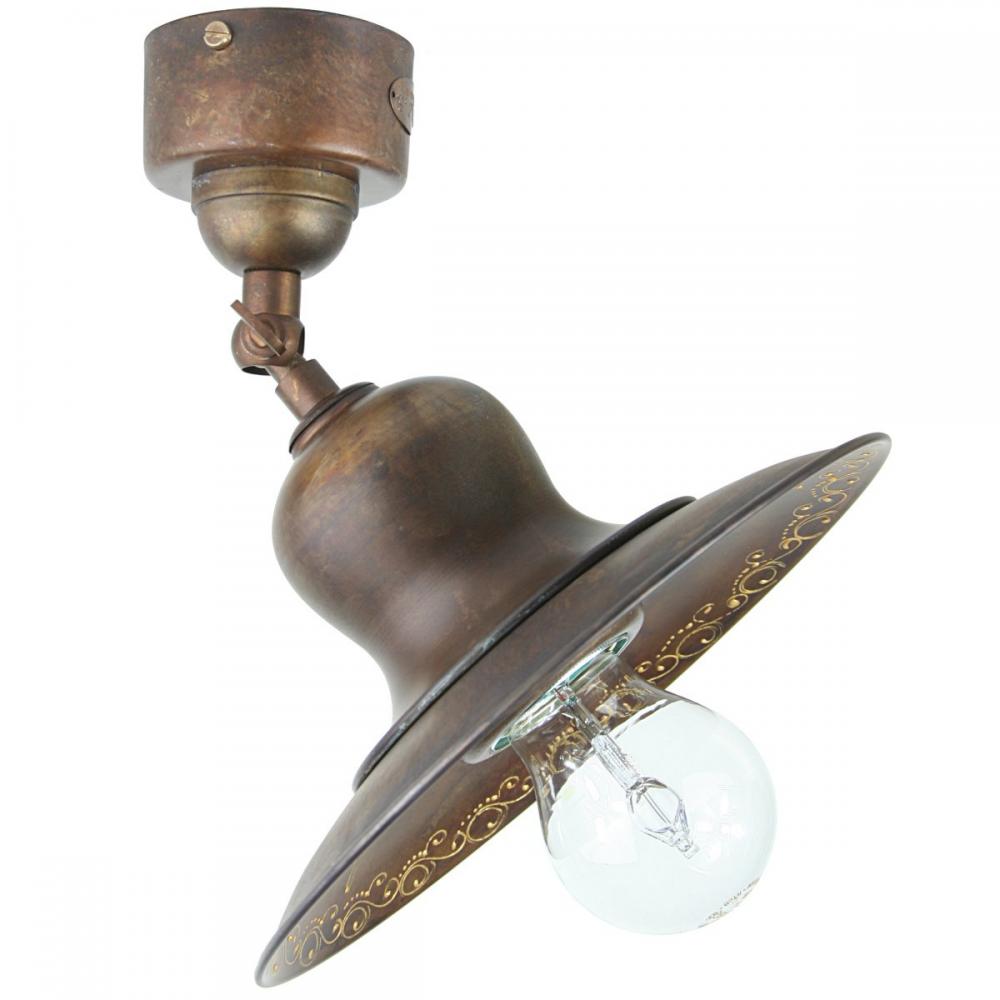 Mosadzná stropná lampa s tienidlom o priemere 14 cm.