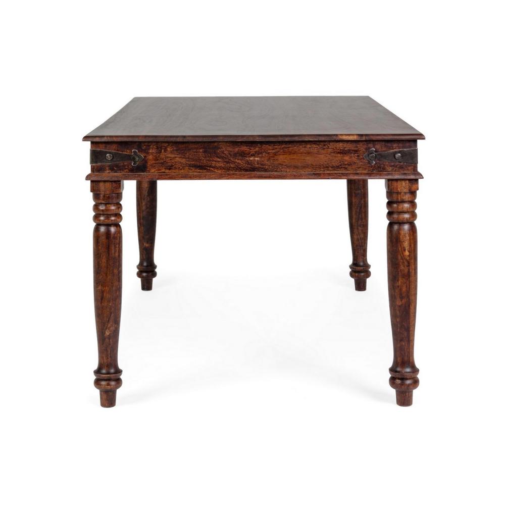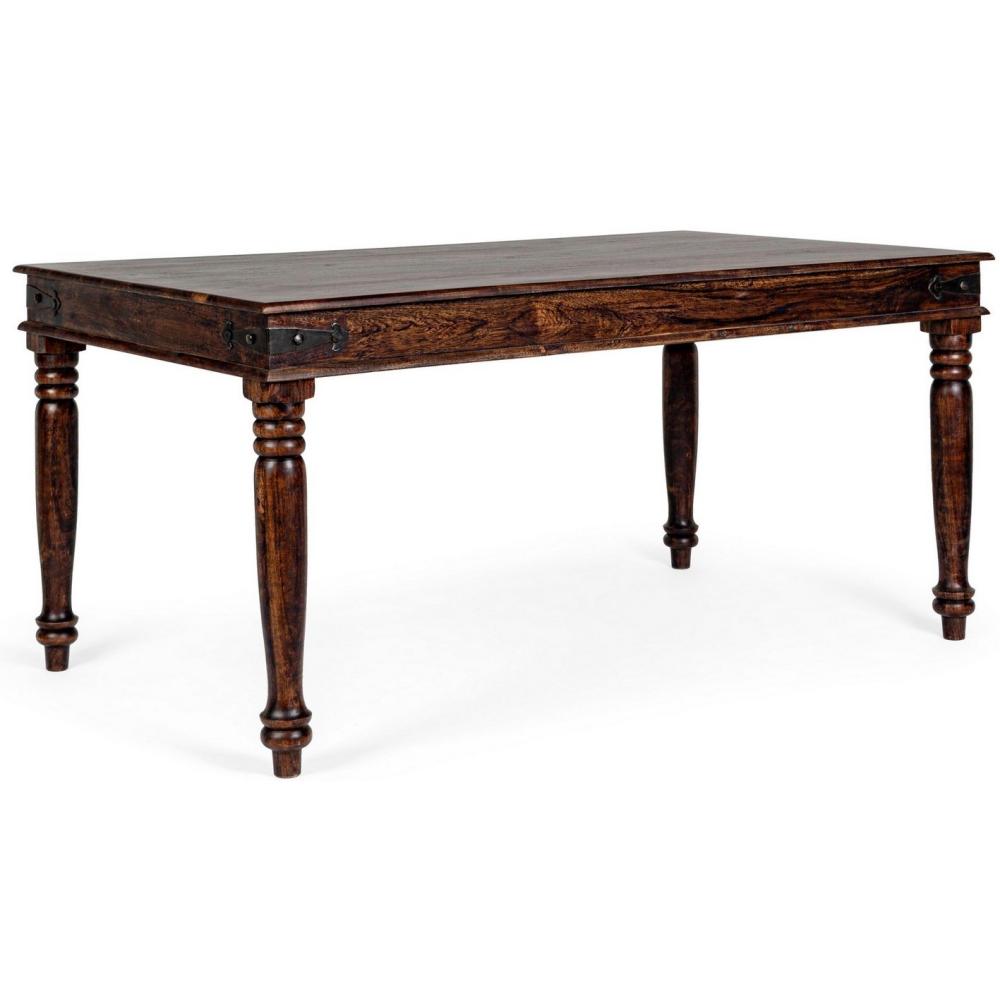 Klasický jedálenský stôl z masívneho akáciového dreva, s kovanými kovovými pásmi na rohoch.